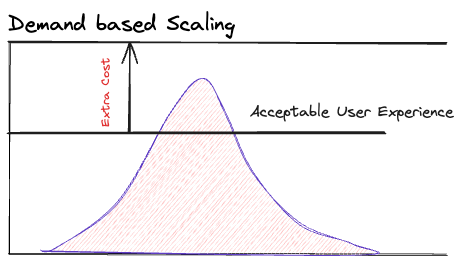 The diagram above illustrates the trade-off inherent in demand-based scaling. The horizontal line represents the threshold of “acceptable user experience,” while the bell-shaped curve shows typical demand over time. As demand increases beyond the acceptable threshold, additional resources must be provisioned, incurring extra costs. Ideally, you want to scale enough to preserve user experience during peak loads, yet avoid over-scaling that leads to runaway expenses.